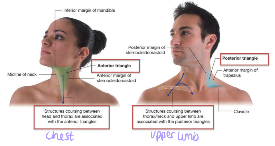 What are the borders of the posterior and anterior triangle of the neck and why are they important?