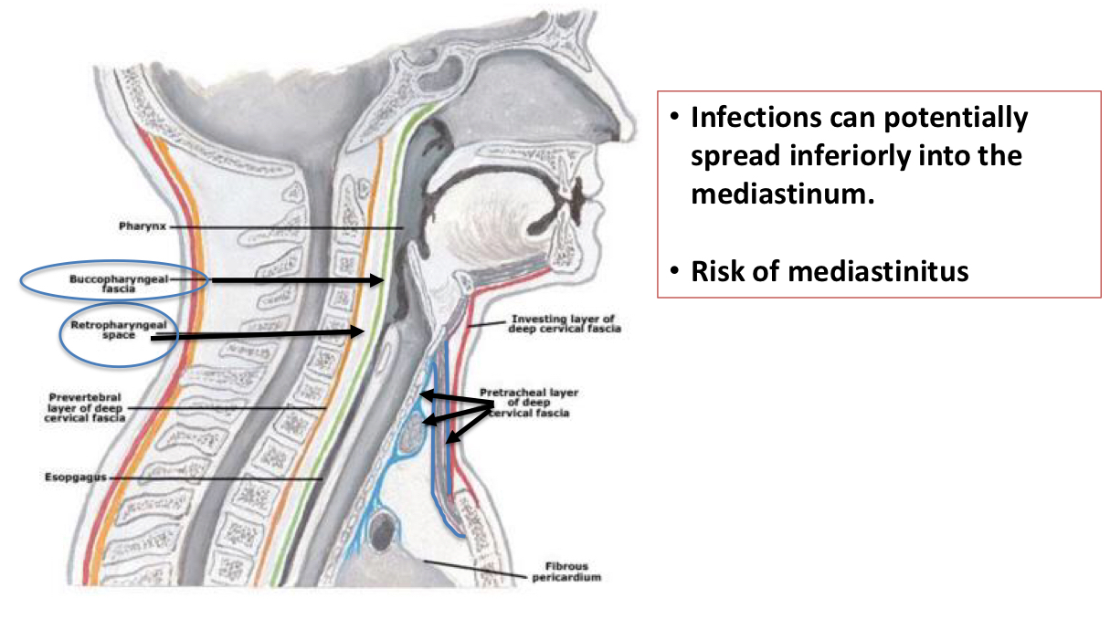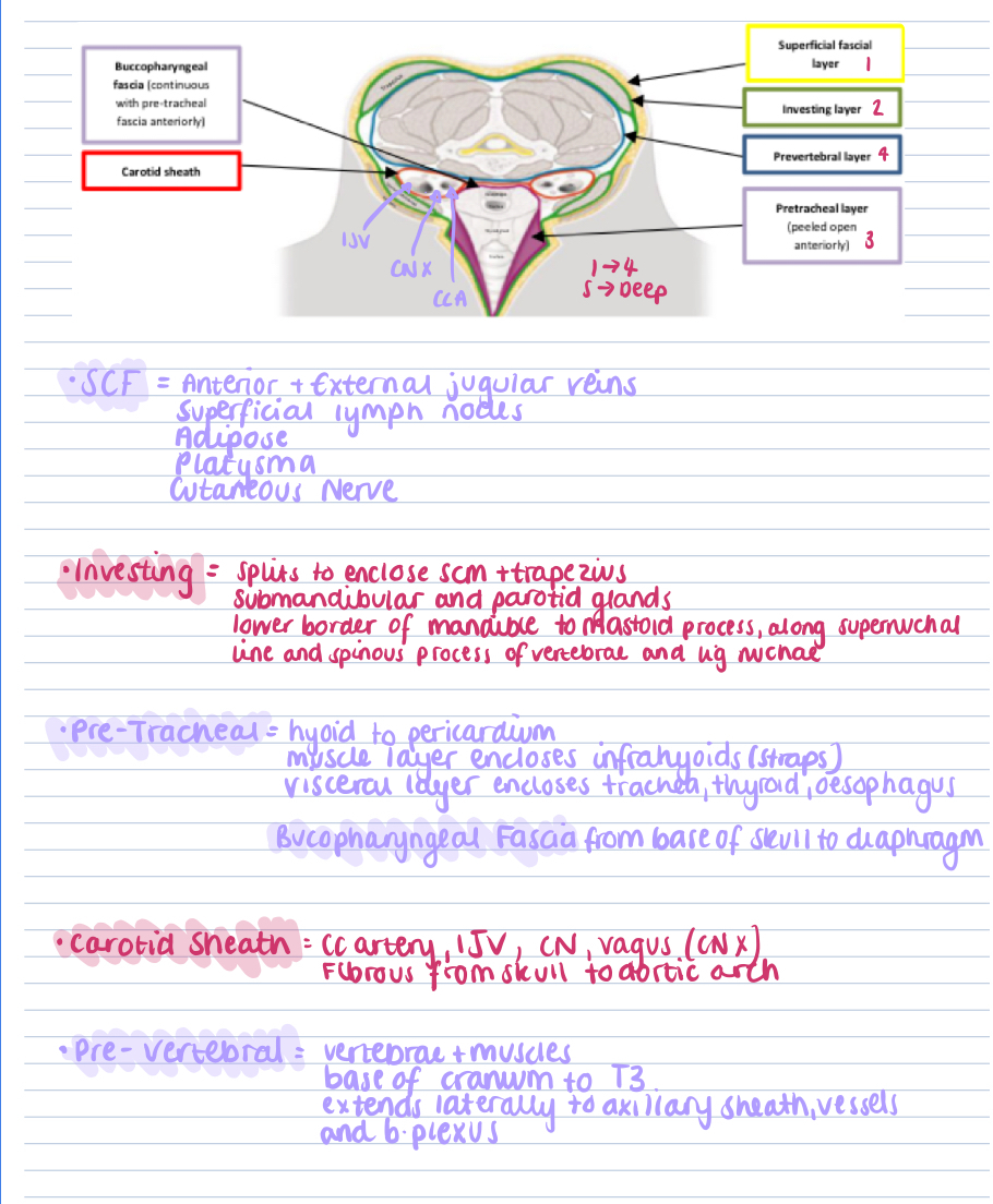 Label the cross section of this neck and explain the importance of the 1 superficial and 3 deep fasical compartments.