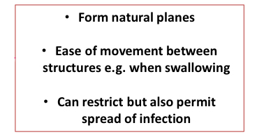 Allows structures to pass over each other and layers to be separated easily in surgery but determines direction and extent of infection