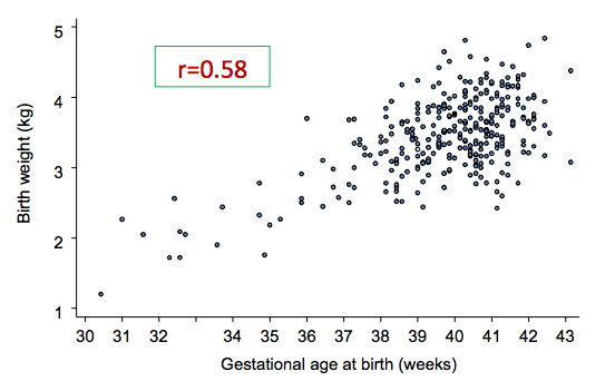 Birth weight is positively correlated with gestational age.