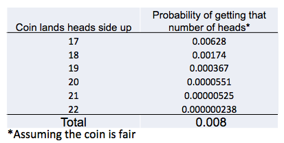 Using the data (pic), how would you calculate the probability of observing at least 17 heads or at least 17 tails (the p-value)? We don’t know which side the coin is biased to.