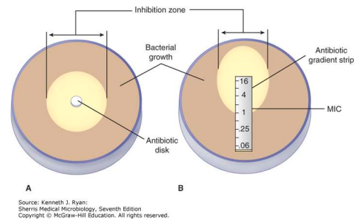 Mesure de la concentration minimale bactéristatique: qté d’ATB la plus faible qui inhibe à 99.9% la croissance bactérienne