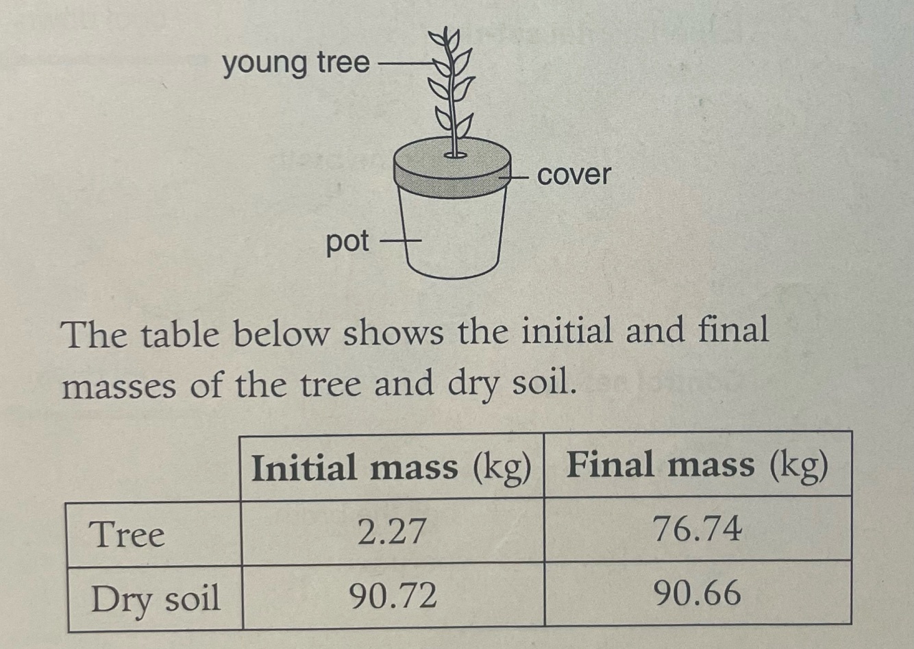 It was once believed that plants grew by absorbing materials from the soil. An experiment was designed to test the idea, in which a young tree was planted in a pot of dry soil, the pot was covered, and the tree was watered regularly for 5 years.
