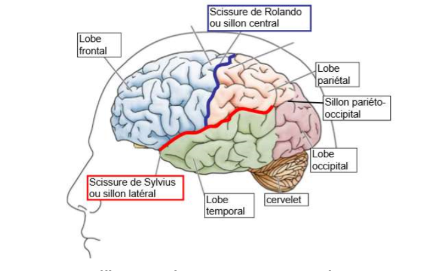 sillon précentral (moteur) en avant de la scissure de Rolando. sillon postcentral (somatosensoriel) en arrière