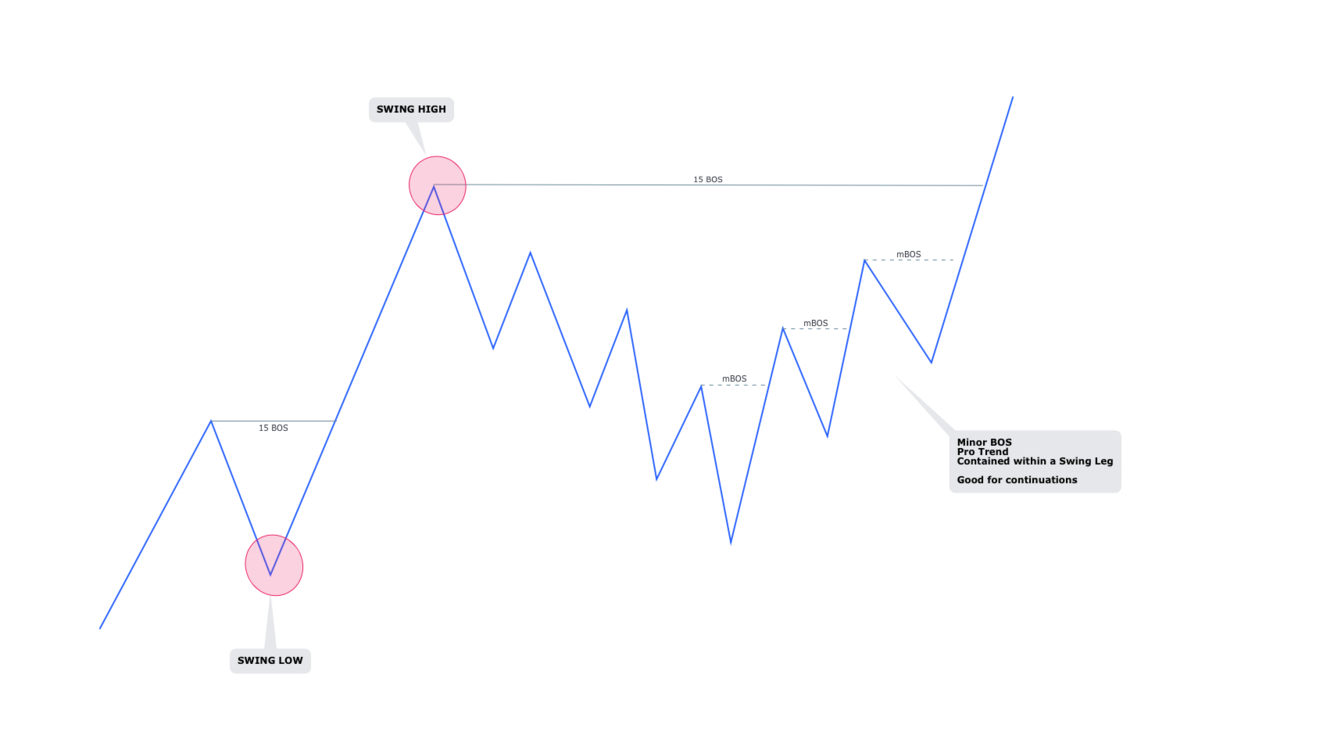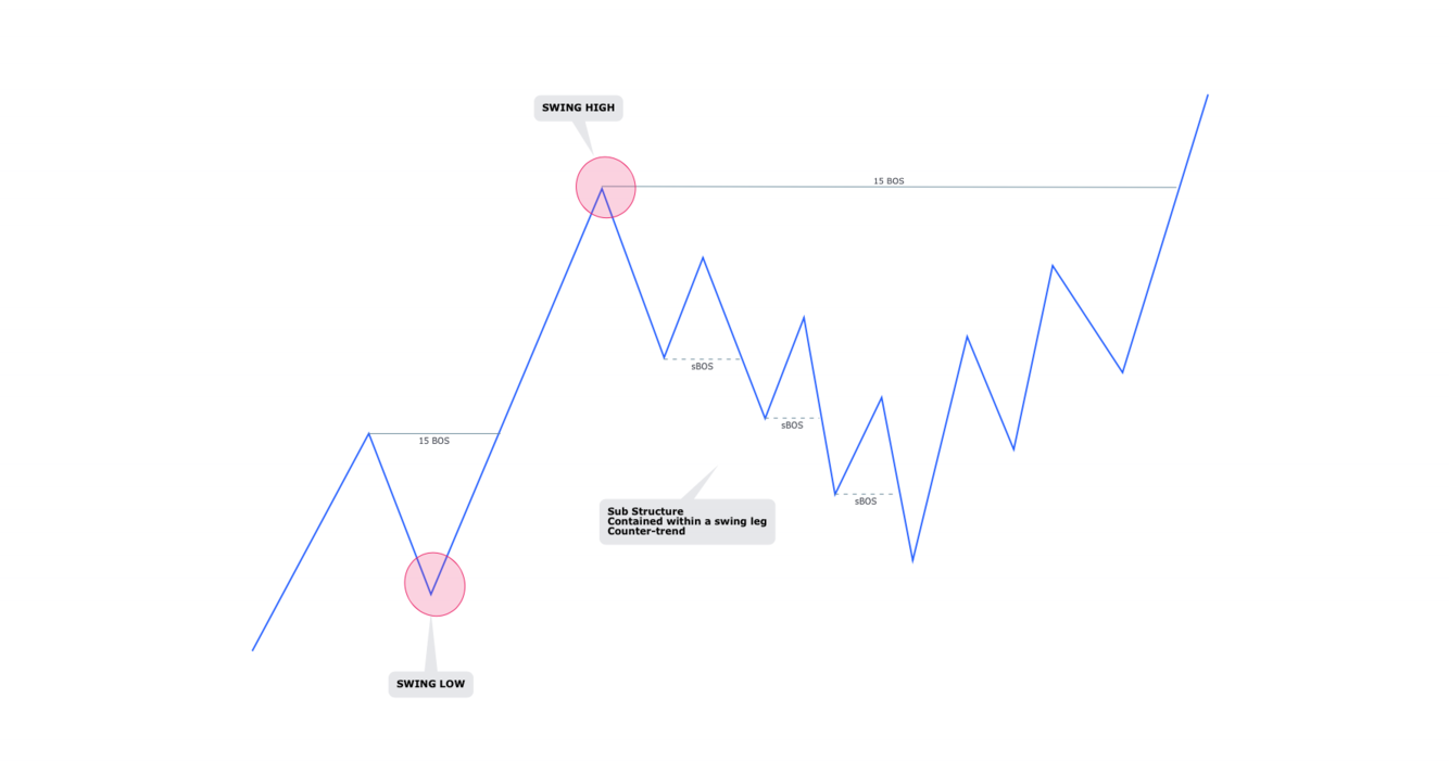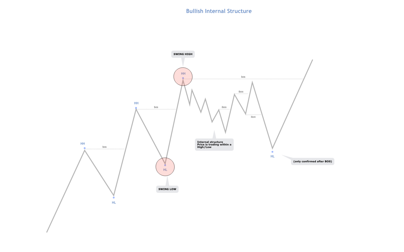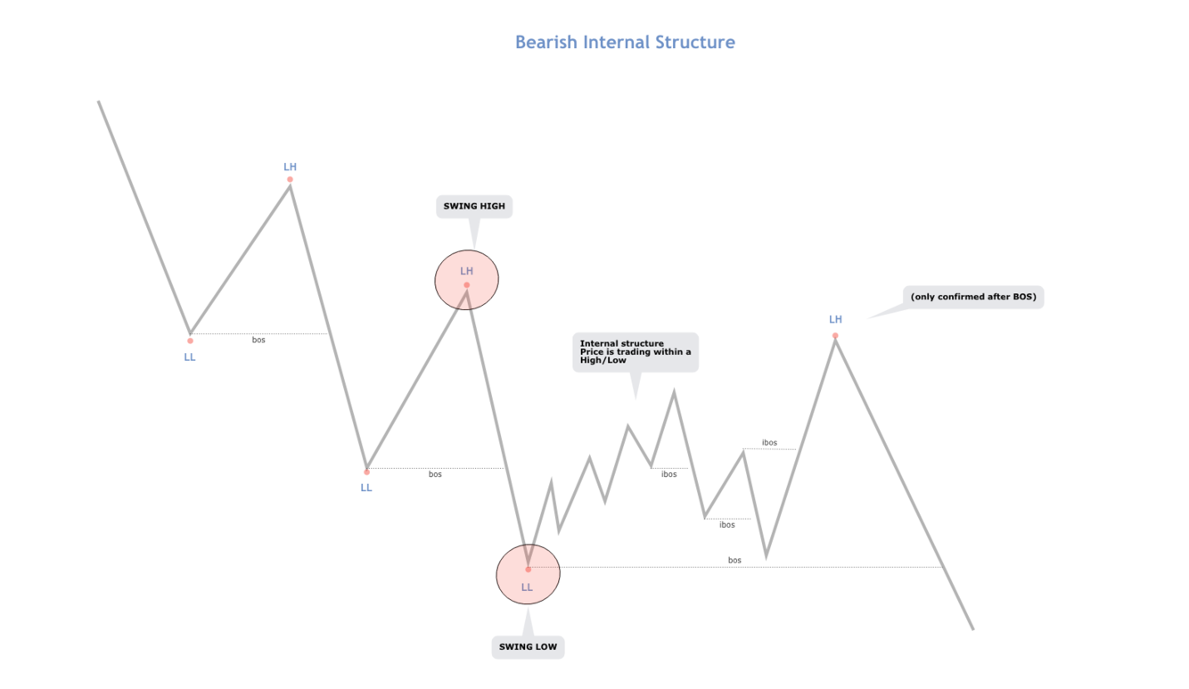 When price is trading within a swing leg and breaking Hs/Ls this is internal structure (iBOS)