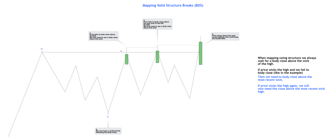 When mapping swing structure we need to see a body close above/below the high/low.
