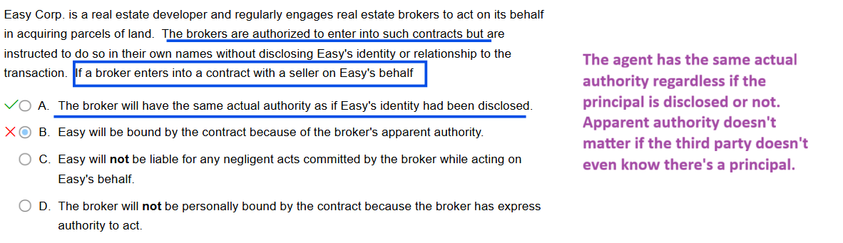 The agent has the same actual authority regardless if the principal is disclosed or not. Apparent authority doesn’t matter if the third party doesn’t even know there’s a principal.