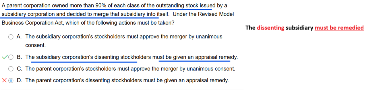 The dissenting subsidiary must be remedied when a parent company who owns more than 90% of the subsidiary decides to merge with the subsidiary