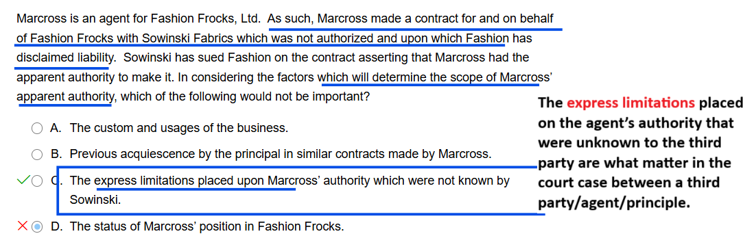 The express limitations placed on the agent’s authority that were unknown to the third party are what matter in the court case between a third party/agent/principle