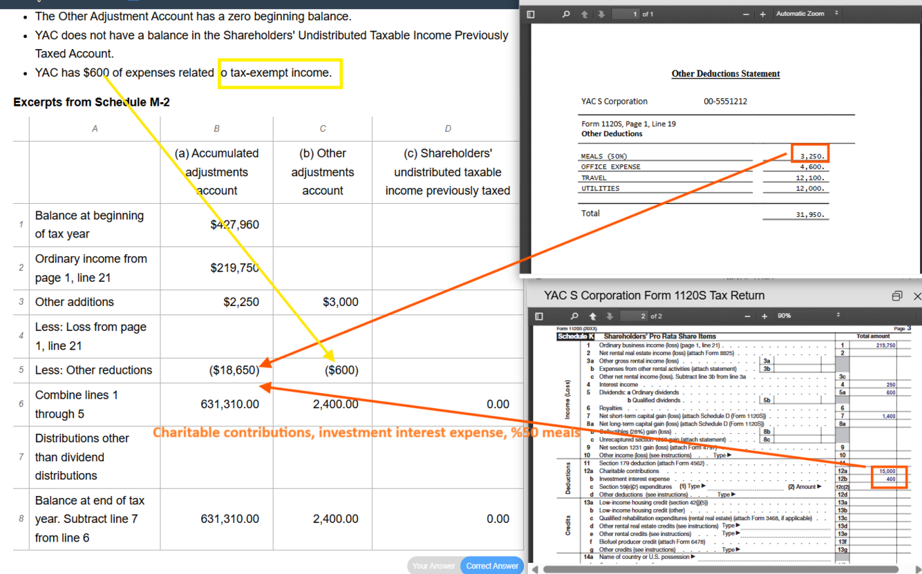 - Charitable deductions, investment interest expense, and 50% meals together in other reductions