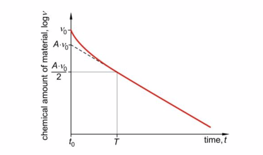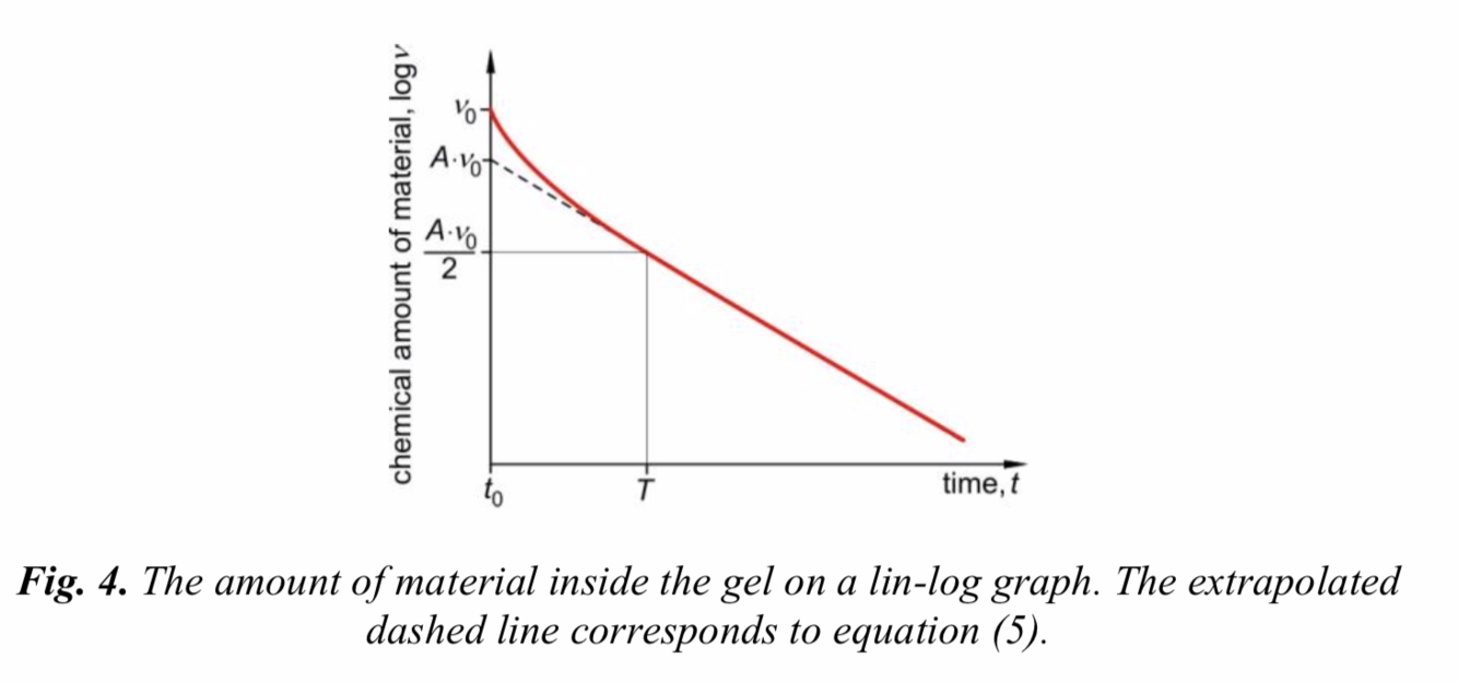 We can see from the lin-log graph (Fig. 4) that, after a sufficiently long time after the beginning of the process, the change of the amount of the material as a function of time becomes exponential.