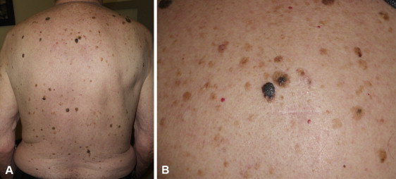 What is a common pathology in elderly that presents as flat tan to brown macules?