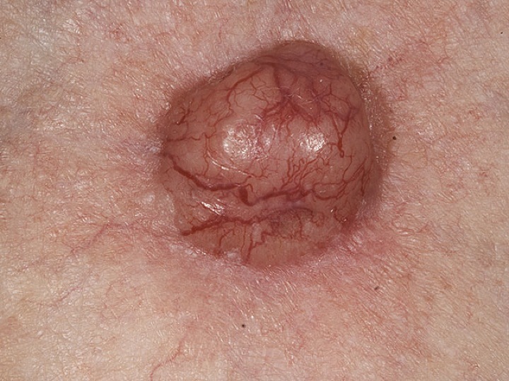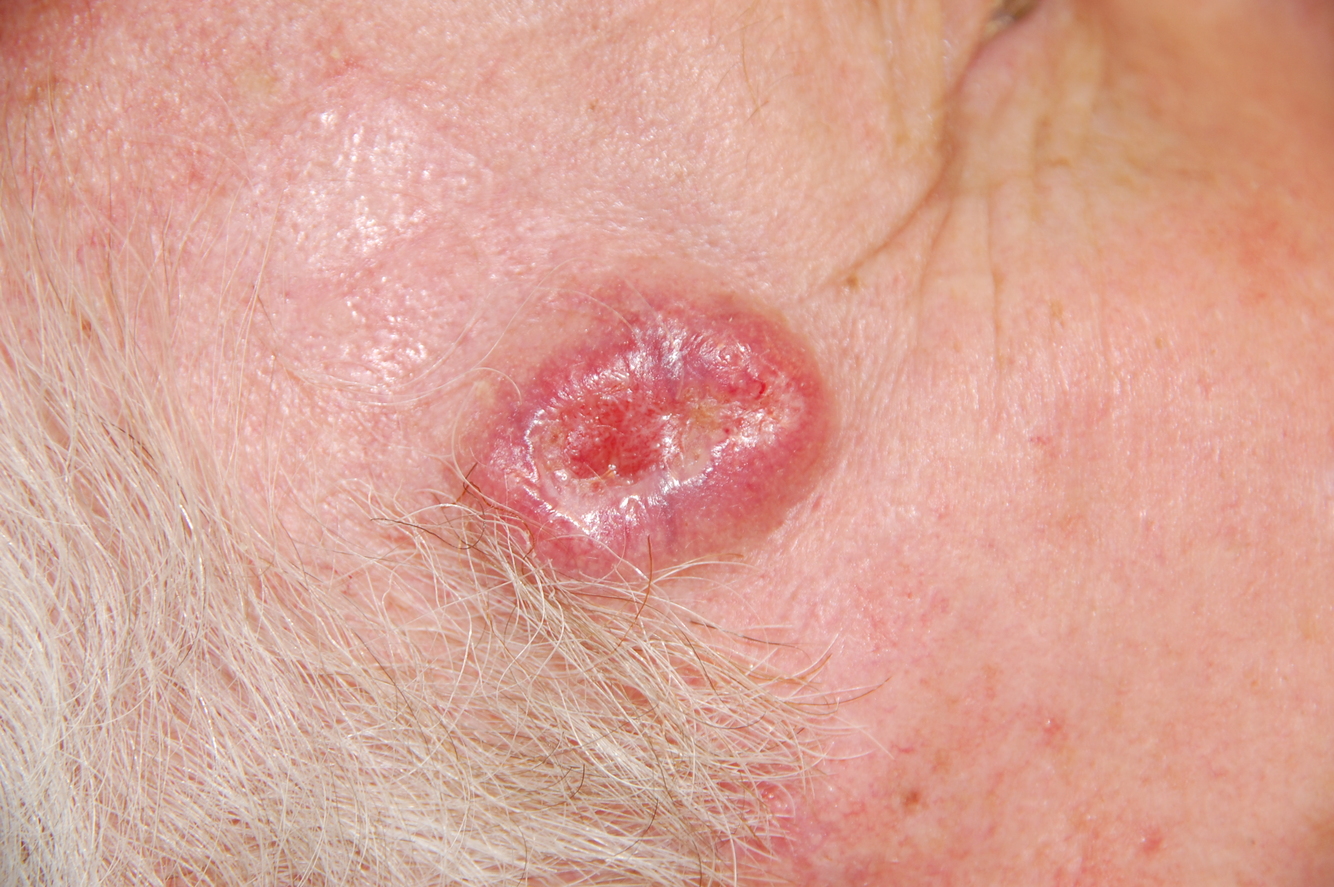 Basal cell carcinoma. Rolled borders and telangiectatic blood vessels.