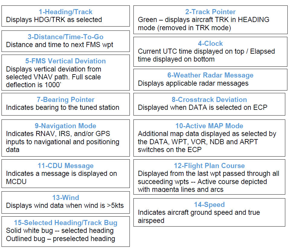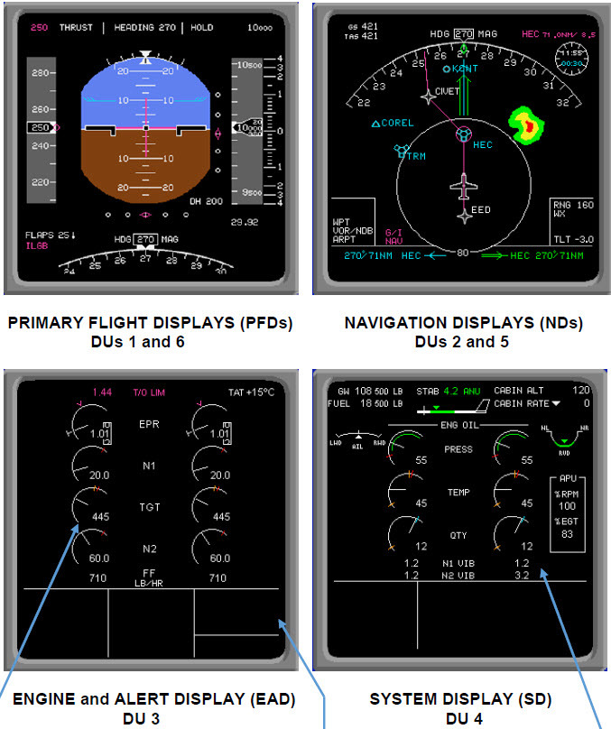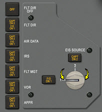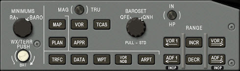 The ECPs contain various switches for pilot selection of flight and navigation data for display on the six DUs. Selectable options include MAP, PLAN, APPROACH, VOR and TCAS information