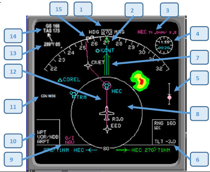 Open magenta circle – Crew has intervened in an FMS profile OR the FMS altitude is beyond that set in the FCP