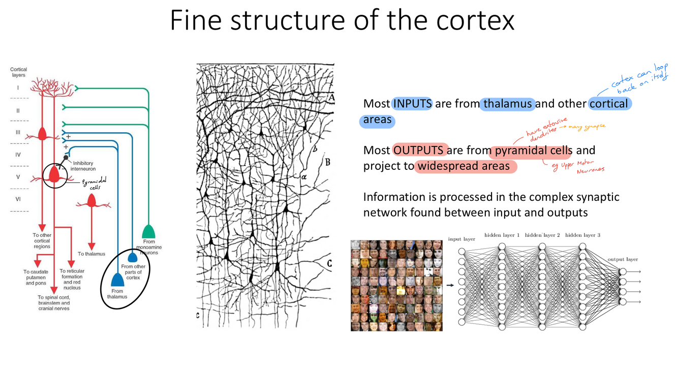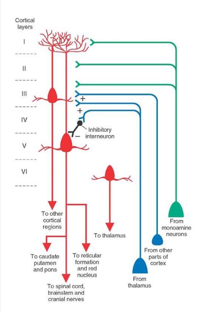 Outputs go to: other cortical regions, thalamus, spinal cord etc (widespread areas)
