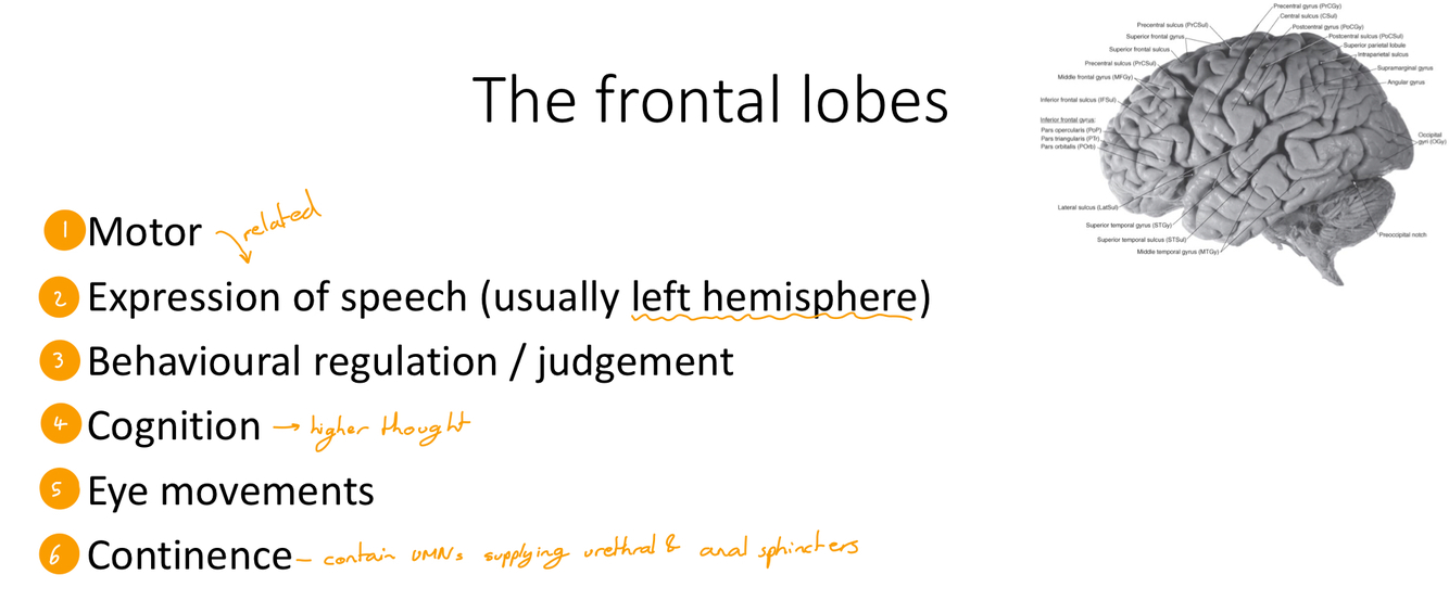 What are the functions of the frontal lobes? (6) (ie what functions may be lost in frontal lobe syndrome)?