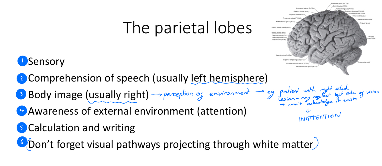 What are the functions of the parietal lobes? (6)