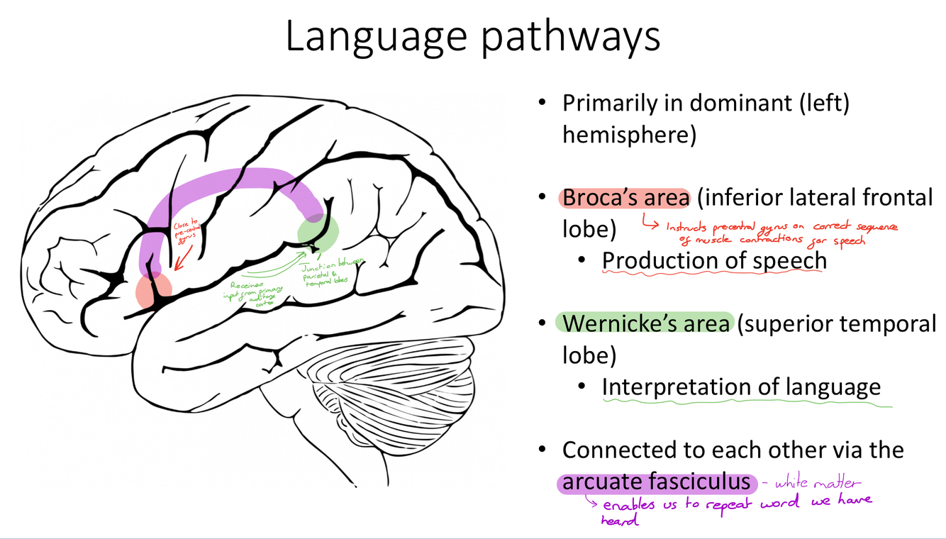 Name the 2 areas which facilitate language, show where they are found on the following diagram, outline how they work and how are they connected?