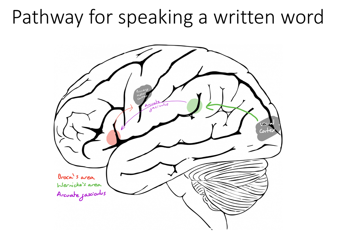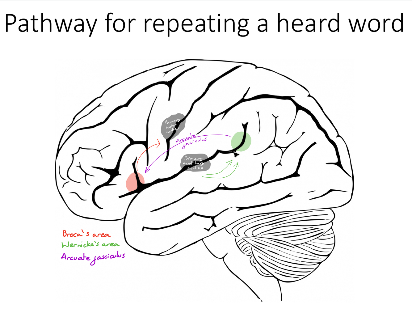 Outline the pathway (with reference to the areas in the left lobe of the brain) how we are able to repeat a heard word.