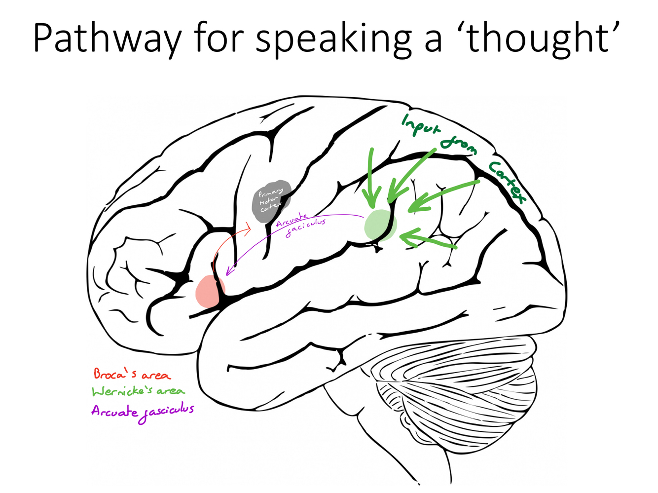 Outline the pathway (with reference to the areas in the left lobe of the brain) how we are able to speak a thought.