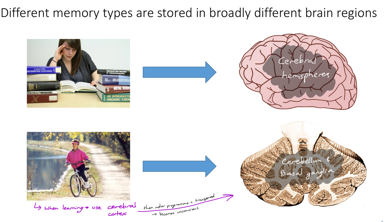Where are the 2 different memory types stored? Why is it that riding a bike for example becomes easier once it’s been learnt?