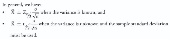 For a normally distributed population, a confidence interval for its mean can be constructed using a z-statistic when variance is known, and a t-statistic whne the variance is unknown. The z-statistic is acceptable in the case of a normal population with an unknown variance if the sample size is large (30+).