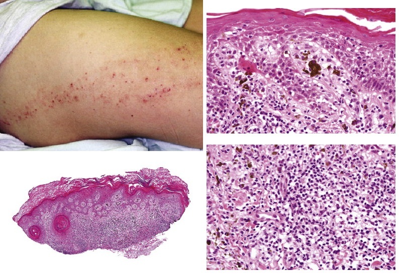 It presents unilaterally along Blaschko’s lines as raised, slightly scaly, erythematous papules, which are often pruritic. These lesions typically regress spontaneously within a year.