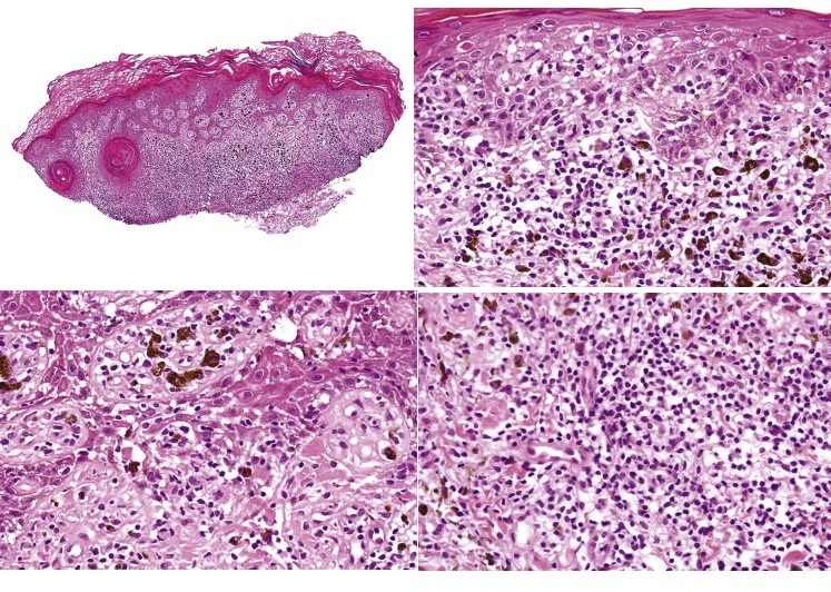 There is a focal lichenoid infiltrate in the papillary dermis with basilar vacuolar alteration and necrotic keratinocytes.