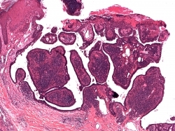 Fig 2 Pilomatrixoma. Low-power view showing a circumscribed basophilic tumor surrounded by compressed fibrous tissue.