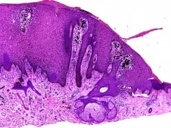 Fig 1 Clear cell acanthoma. There is parakeratosis, psoriasiform hyperplasia, and epidermal pallor.