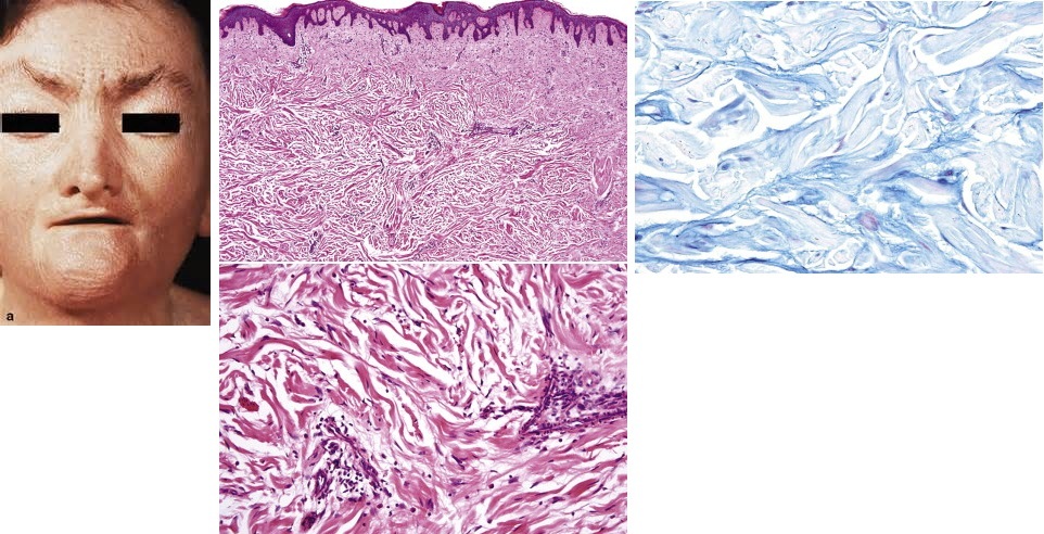 The description of the biopsy above is that of scleromyxedema. These patients have an associated IgG lambda paraprotein. Other IgG subtypes may occur but lambda is most common. Scleromyxedema is a subset of lichen myxedematosus (papular mucinosis). It will present with coalescent erythematous to yellow papules and plaques. The most common location is the face, but will occur in many other locations. The surrounding skin is usually sclerodermoid in appearance. (Bolognia, p648-9)