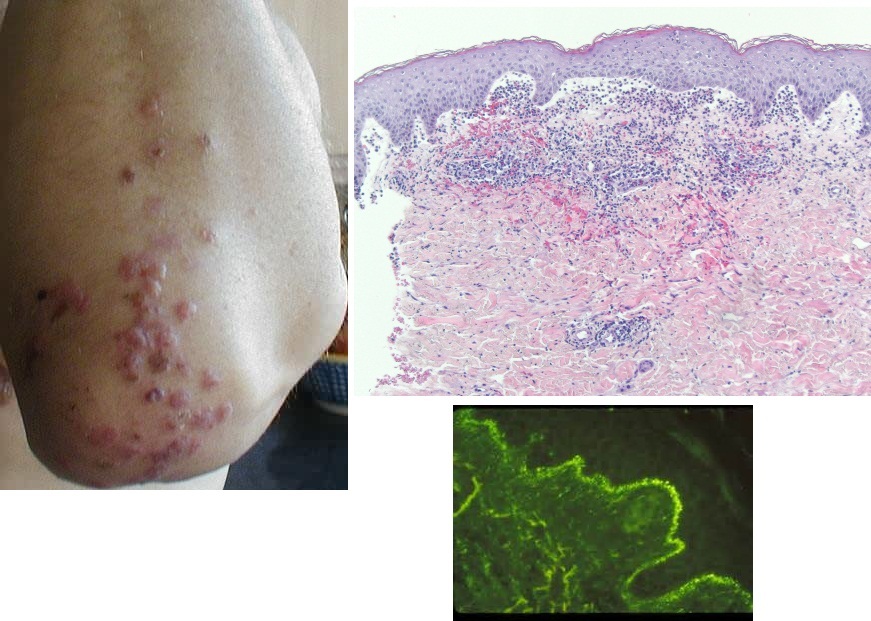 Cicatricial pemphigoid is an autoimmune blistering disease that presents with ulcers, blisters and erosions of mucosal surfaces, especially the eyes and mouth. The cleft in cicatricial pemphigoid is found in the basement membrane zone/subepidermal as the antigens are usually BPAg2,laminin 5 and alpha-6-beta-4 integrin. Direct immunoflourescence is identical to that of bullous pemphigoid showing linear IgG and complement deposits in the basement membrane zone.