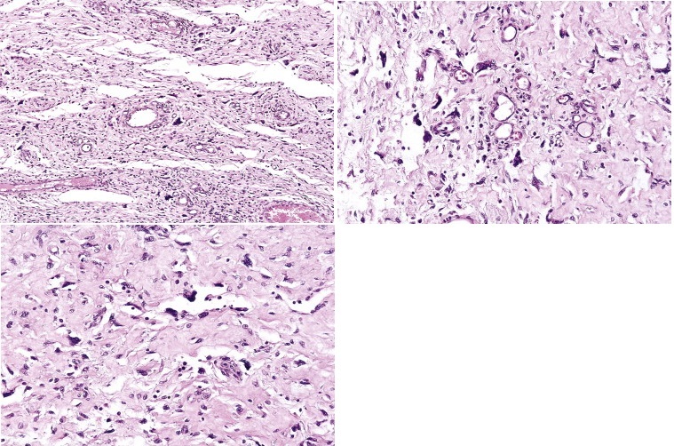Fig 6 Dermatofibrosarcoma protuberans. Occasionally, excessive mucin deposition is a feature. Usually, more typical features are evident elsewhere in the lesion.
