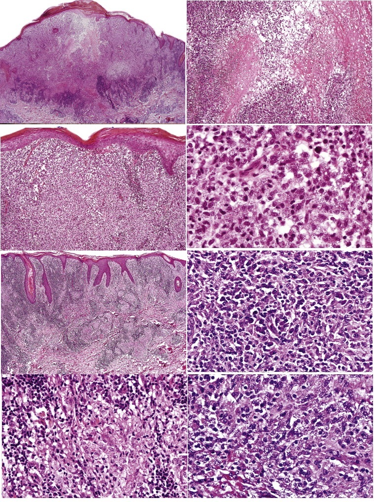 Histiocytosis X:** Yellow brown papules with strongly adherent scaly crusts. Scalp, trunk, mucous membrane. **Histology: Large histiocytes with kidney-shaped nuclei. Infiltrate invades the epidermis. Ultrastructure: Birbek granules. S-100 (+) Treatment: Chemo