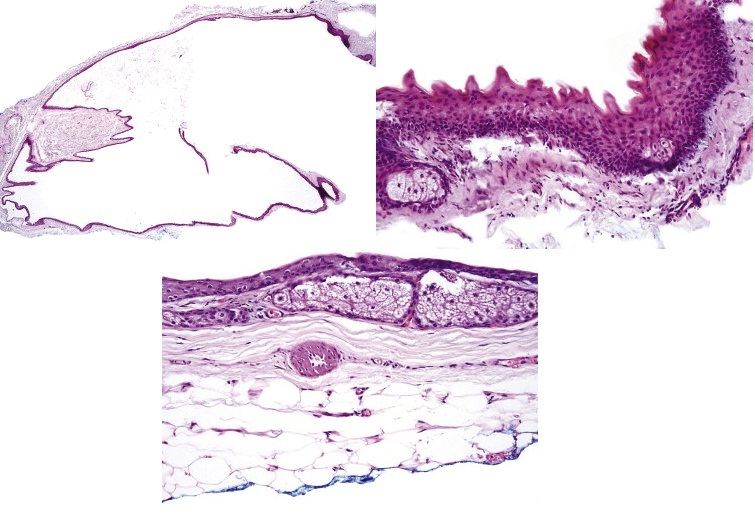 Fig 3 Syringocystadenoma papilliferum. Superficially, the double-layered apocrine epithelium is replaced by squamous epithelium