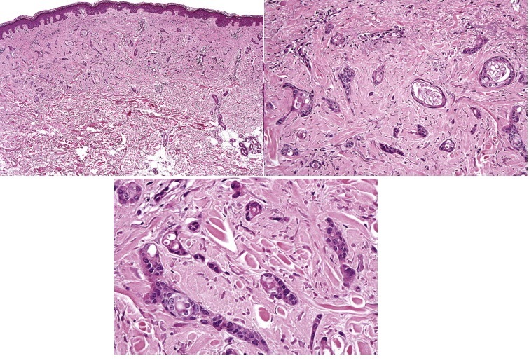 Fig 2 Syringoma. There are well-formed tubules, some with attached attenuated epithelial strands—the so-called tadpole appearance.