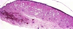 Syringomas on the eyelids, cheeks, chests and can be eruptive and increased numbers in Down’s syndrome and a clear cell change has been associated with diabetes. Histologically this is a dermal tumor consisting of eccrine ducts, lined by two cell layers sometimes creating a tad pole appearance, there can also be small basaloid islands or strands of cells. Within the lumens of the ducts is eosinophilic material, the lumens are CEA+. The tumor is located superficially and fails to display perineural extension as is seen in MAC. The glands are associated with a fibrous sclerotic stroma, usually no (or minimal) keratin cysts or foreign body granulomas as seen in desmoplastic trichoepithelioma. Enlargement of the glandular cells more of a clear or vacuolated cytoplasm can be seen in patients with diabetes.