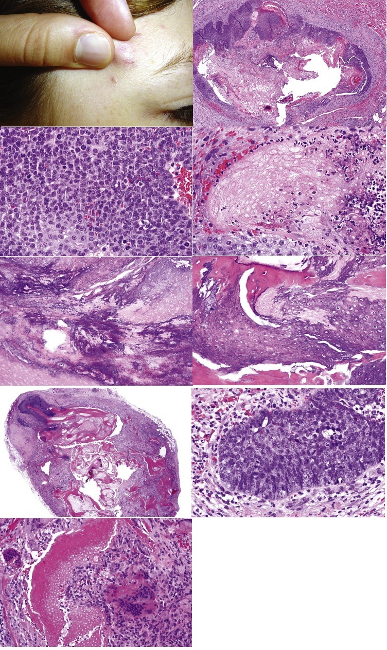 Pilomatrixoma (Calcifying epithelioma of Malherbe): Found on the head, neck and upper extremities in the first 2 decades of life. Typically solitary but multiple pilomatricomas arise in several syndromes. Even in isolation these tumors may arise due to activating mutations in the beta-catenin gene. Histologically: This tumor consists of two major cell types plus an intermediate or transitional cell type. Initially the tumor is more cystic with the cells at the periphery of the tumor that are more basophilic with indistinct cell borders and little cytoplasm. The cells have hyperchromatic nuclei and often normal mitoses can be appreciated. Centrally there are eosinophilic “ghost or shadow†cells which are cells that have undergone terminal differentiation. These cells have more distinct borders, increased cytoplasm but only a ghost of a nucleus. Then there are cells that reside somewhere in between these two cell types. The proportion of these cells varies depending on the stage of the lesion; i.e younger lesions have more basophilic cells and appear more cystic, older lesions have a greater component of ghost cells and up to 20% of lesions on removal are completely composed of ghost cells.