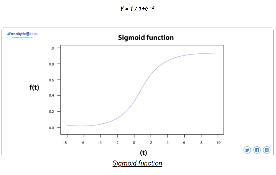 It is a mathematical function having a characteristic that can take any real value and map it to between 0 to 1 shaped like the letter “S”. The sigmoid function also called a logistic function.