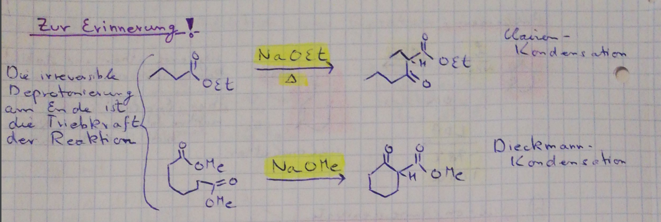 Gib kurz die Reaktionslgeichung von Dieckmann und Claisen Kondensation an!