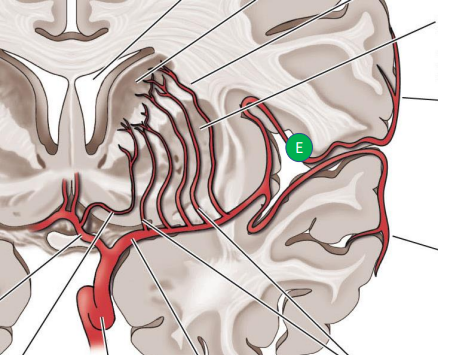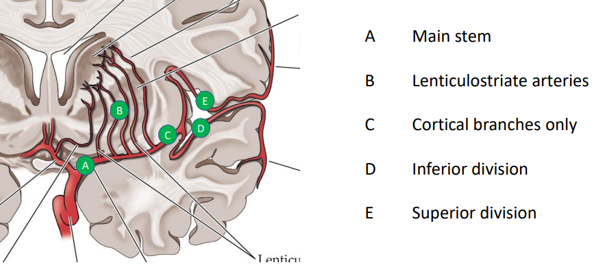 Superior divison supplies lateral frontal lobe, primary motor cortex and Broca’s area