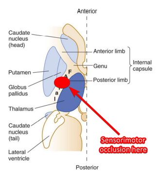 - Damage to sensory fibres travelling through internal capsule- due to occlusion of thalamoperforator arteries, maybe lenticulostriates