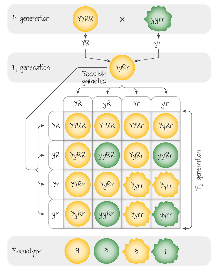 Homozygous yellow, round peas (genotype YYRR) were crossed with homozygous green, wrinkled peas (genotype yyrr).