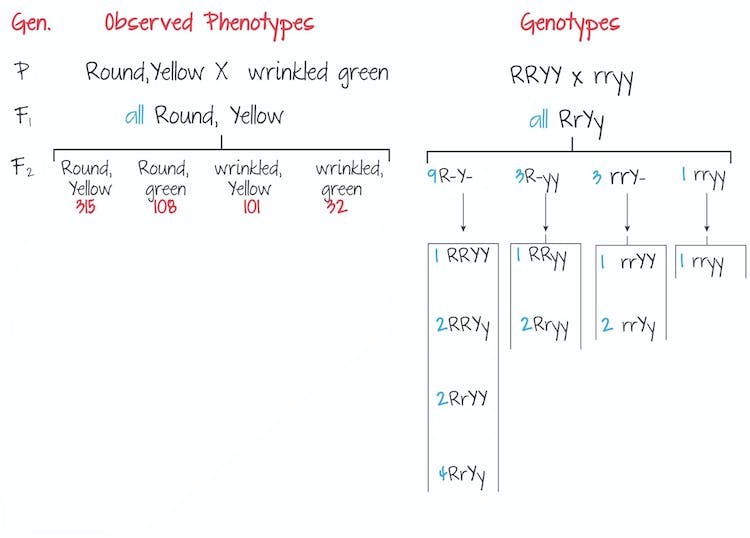 This diagram shows an example of the phenotypic results Mendel collected for one dihybrid cross as well as the modern explanation in terms of genotype.