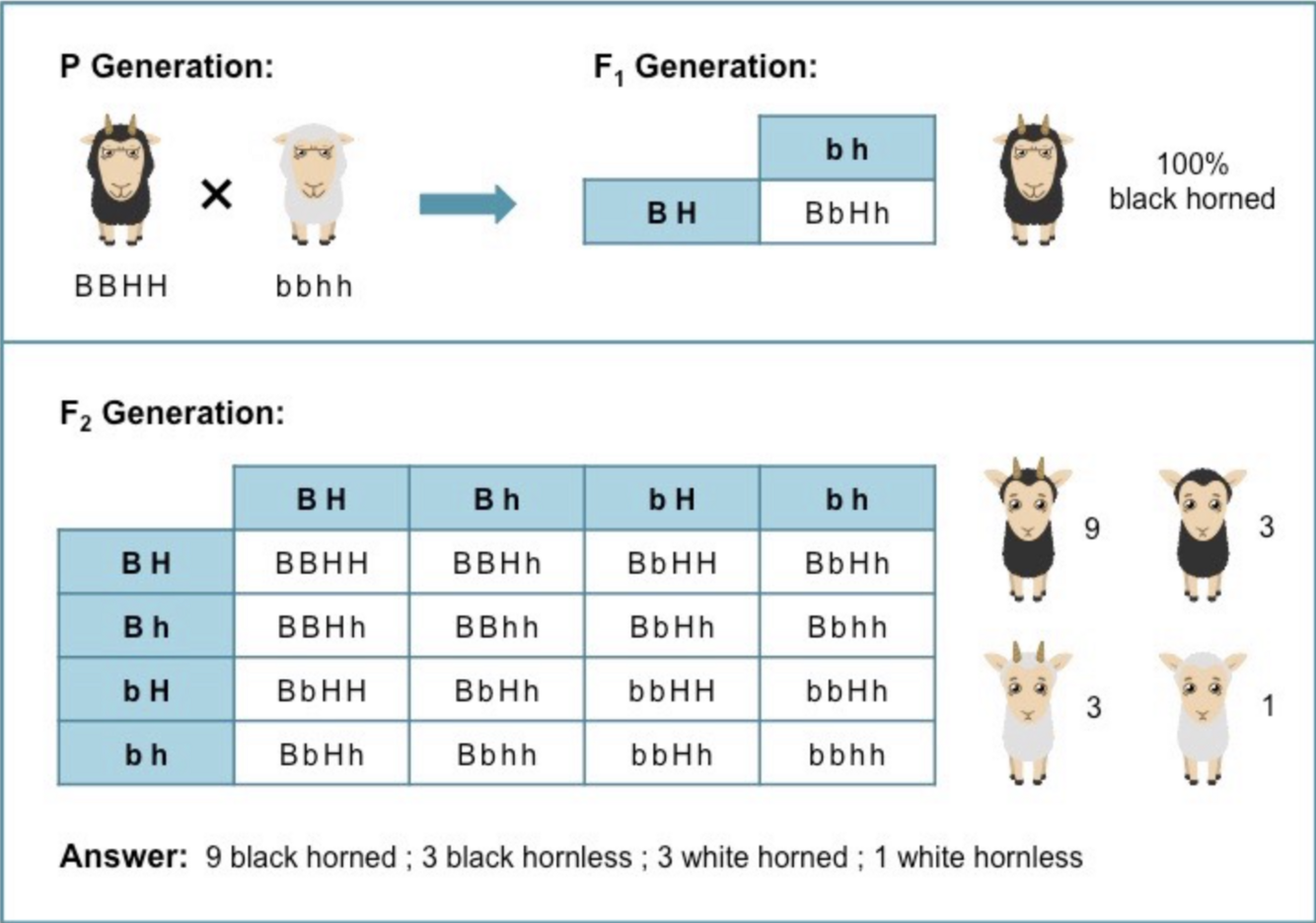 Pure breeding horned sheep with black wool were crossed with pure breeding hornless sheep with white wool.