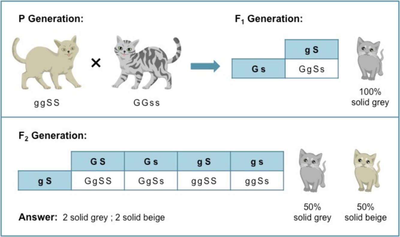 A pure breeding solid, beige cat is crossed with a pure breeding striped, grey cat.