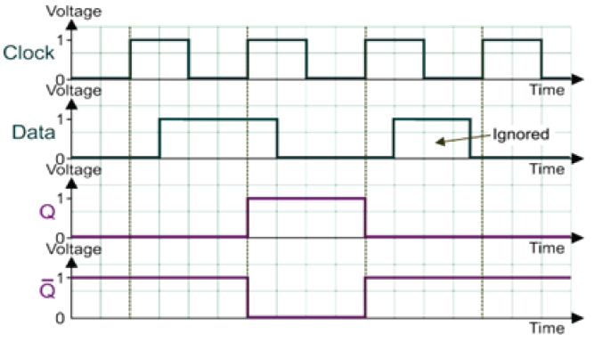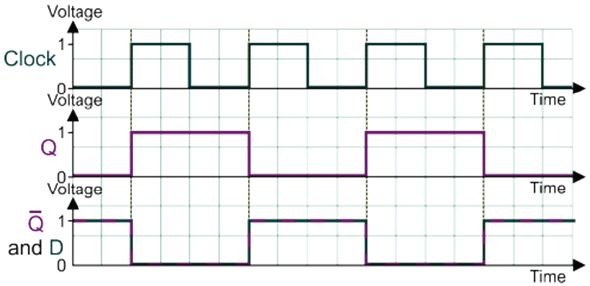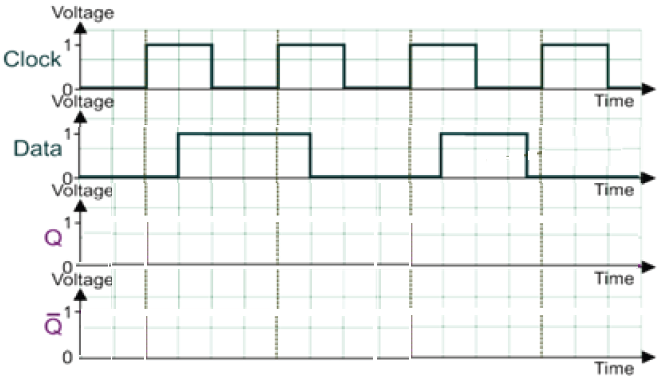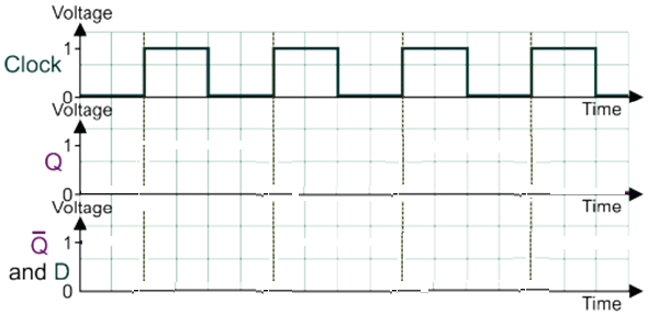 For a D-type flip-flop, show how the following clock and data signals create output Q and NOT-Q