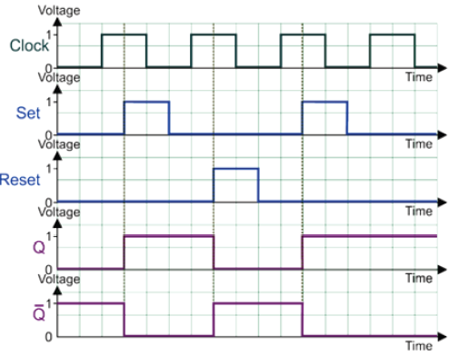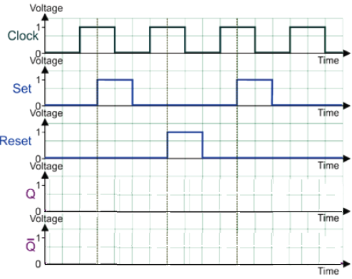 For a D-type flip-flop, show how the following clock, Set and Reset signals create output Q and NOT-Q