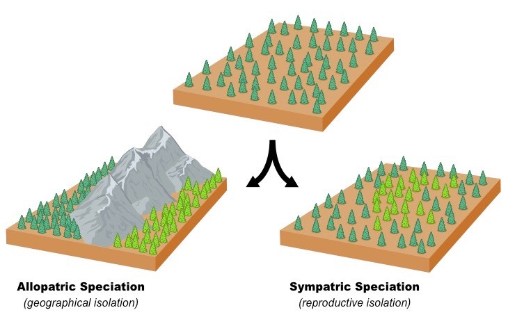 Due to geographical barrier - physically isolates populations - evolve separately - cumulative mutation, genetic drift, natural selection - can no longer interbreed - distinct species (speciation)